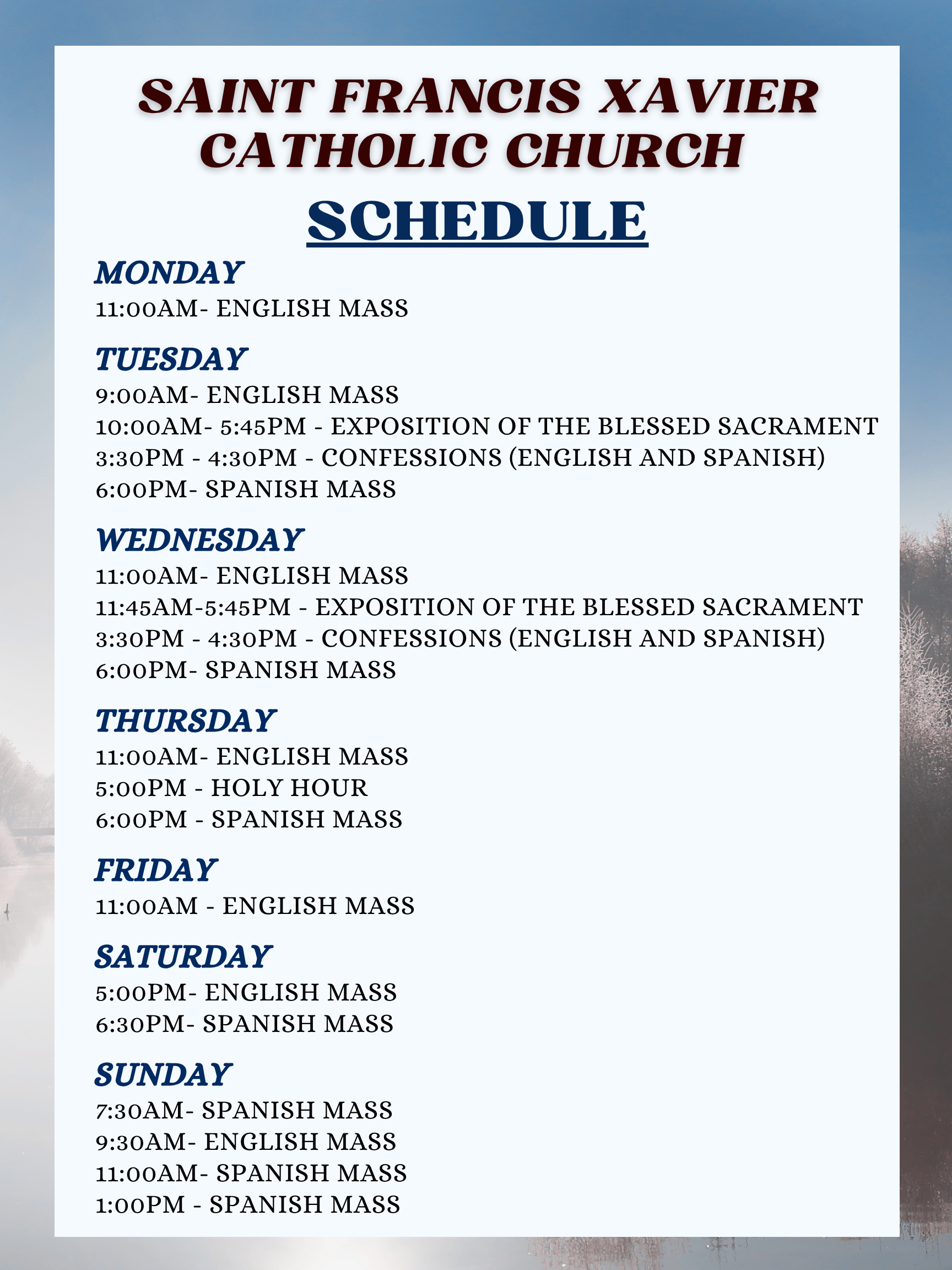 Sunday - 7:30am Spanish| 9:30am English | 11:00am Spanish | 1:00pm Spanish
